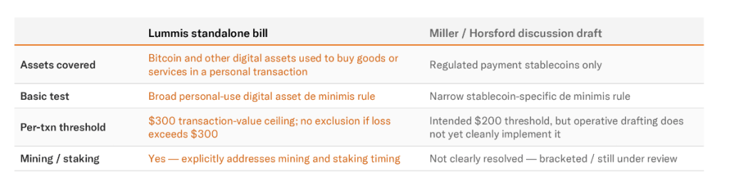 The legislative picture is complicated by competing proposals. While the Lummis bill targeted Bitcoin and broader crypto transactions, a separate House bill introduced by Representatives Max Miller and Steven Horsford focused exclusively on dollar-pegged stablecoins.