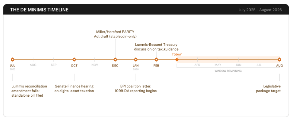 The group is pushing for a de minimis tax exemption — a rule that would allow small Bitcoin transactions under a set dollar amount to bypass capital gains reporting entirely.