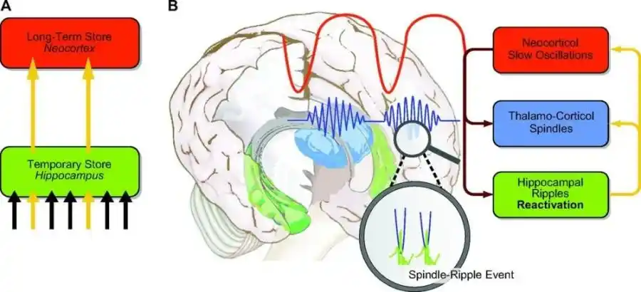 Active systems consolidation model during sleep. A (Data Migration): During deep sleep (slow-wave sleep), memories recently written to the 'hippocampus' (temporary storage) are repeatedly replayed, gradually transferred, and consolidated into the 'neocortex' (long-term storage). B (Transmission Protocol): This data transfer process relies on highly synchronized 'dialogue' between the two regions. The cerebral cortex emits slow brainwaves (red line) as the master rhythm. Driven by the wave peaks, the hippocampus packages memory fragments into high-frequency signals (green line, sharp-wave ripples), perfectly synchronized with the carrier waves (blue line, spindle waves) emitted by the thalamus. This is like embedding high-frequency memory data precisely into the gaps of the transmission channel, ensuring information is synchronously uploaded to the cerebral cortex. | Image source: National Library of Medicine (United States)