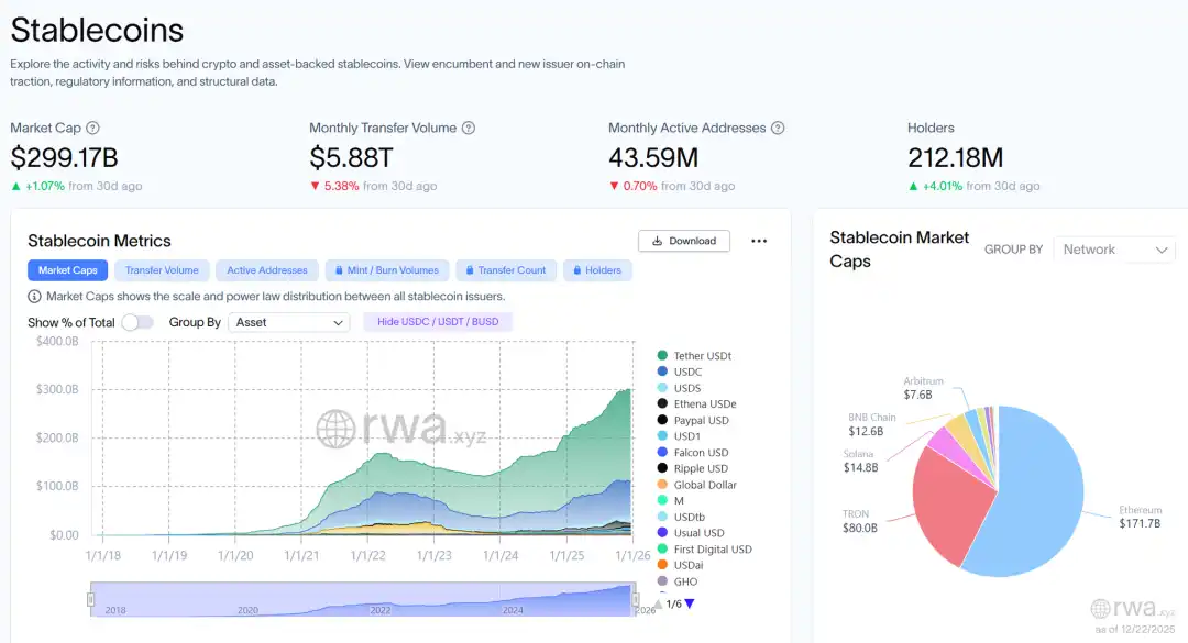 The most direct signal for the year was the substantial thickening of the on-chain dollar base: total stablecoin supply expanded from ~$205B to over $300B, and highly concentrated in the leaders (year-end附近 USDT ~$186.7B, USDC ~$77B); issuers collectively held ~$155B in US Treasury bills, making stablecoins closer to an infrastructure combination of 'tokenized cash + short-duration treasuries'. Usage side also strengthened: stablecoins accounted for ~30% of on-chain crypto trading volume, with annual on-chain activity exceeding $4T, payment-type on-chain trading volume estimated at $20–30B/day量级, real demand for cross-border settlement and fund transfer continued to rise.