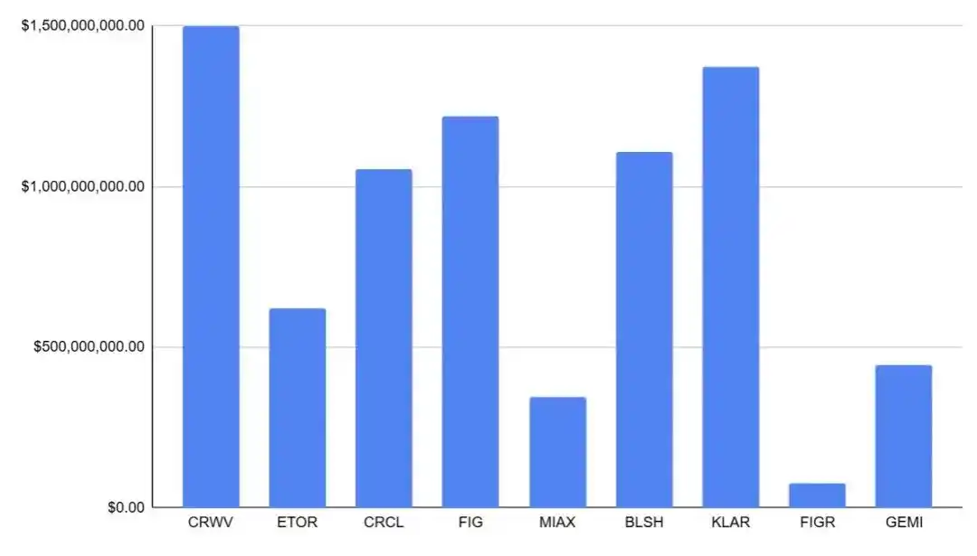 * Listing path/IPO: 9 crypto/related companies completed IPOs in 2025, raising a total of ~$7.74 billion; valuations ranging from ~$1.8 billion to $23 billion; initial float ~7.6%–26.5%.