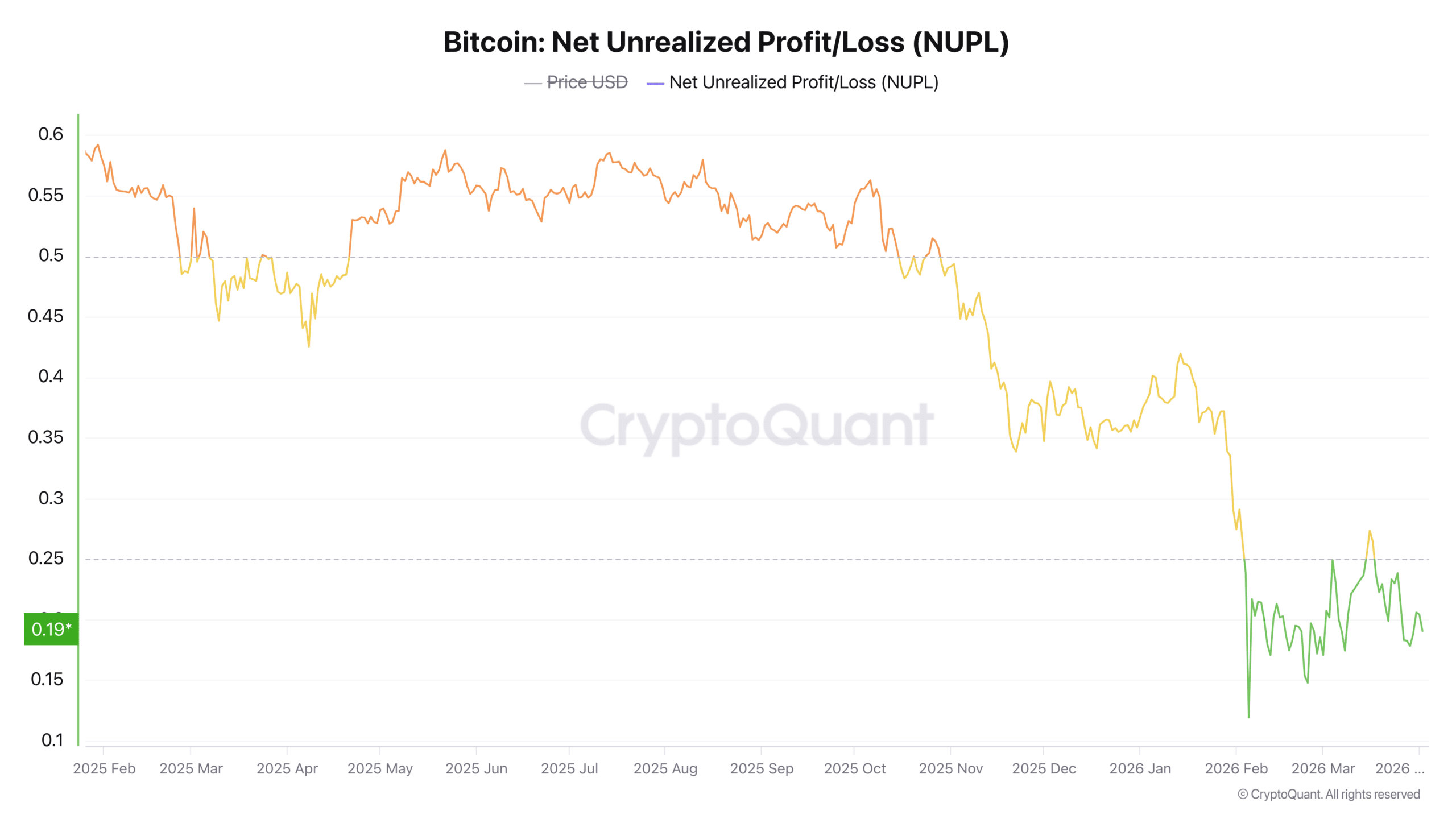 The Net Unrealized Profit/Loss (NUPL) metric reinforces this trend. At 0.6, it indicates a sharp compression in unrealized gains across the network.