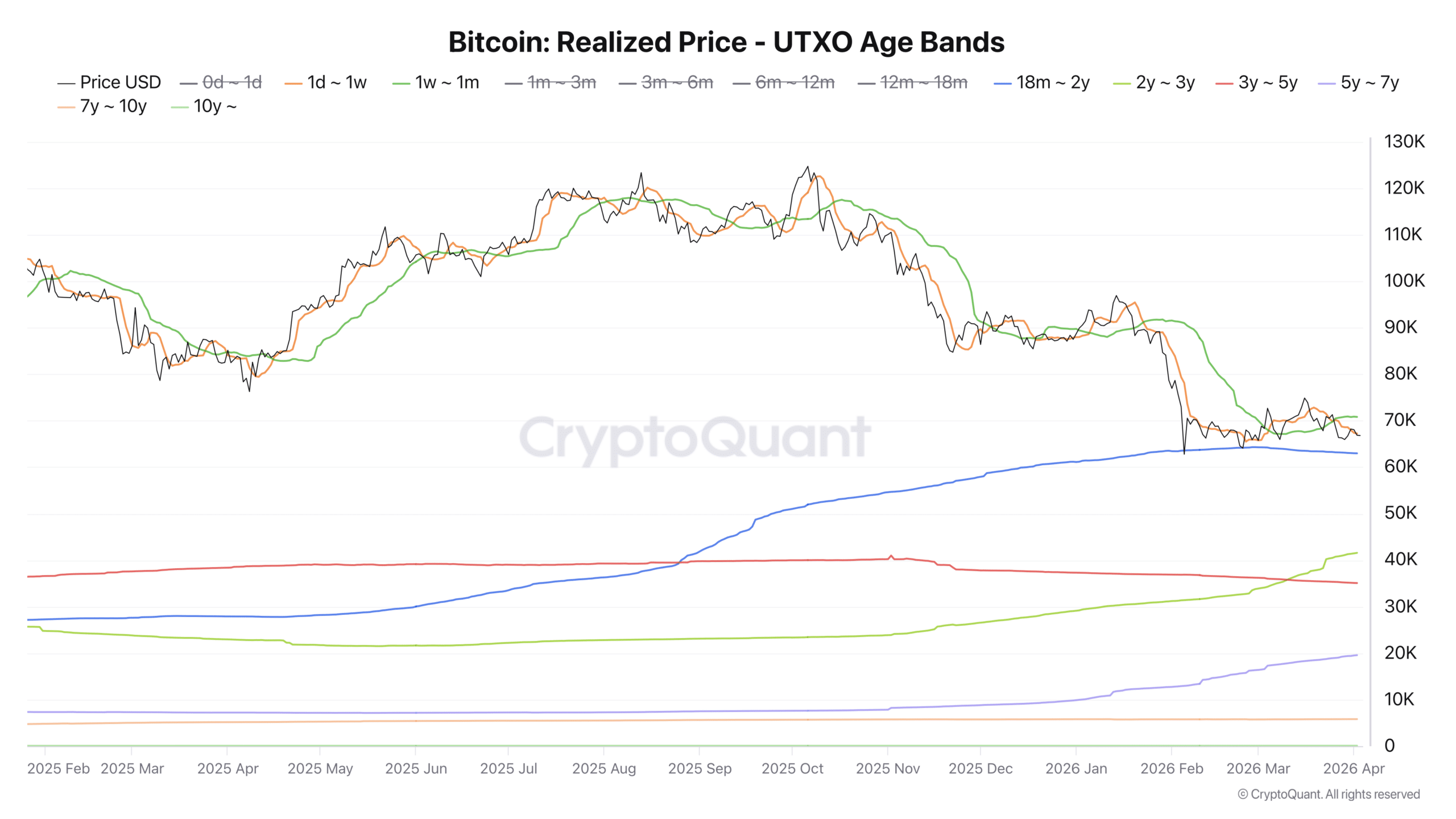 On-chain data from the UTXO Realized Price Age Distribution highlights a critical development. The metric tracks the average acquisition price of Bitcoin across different holding periods, offering insight into investor positioning.
