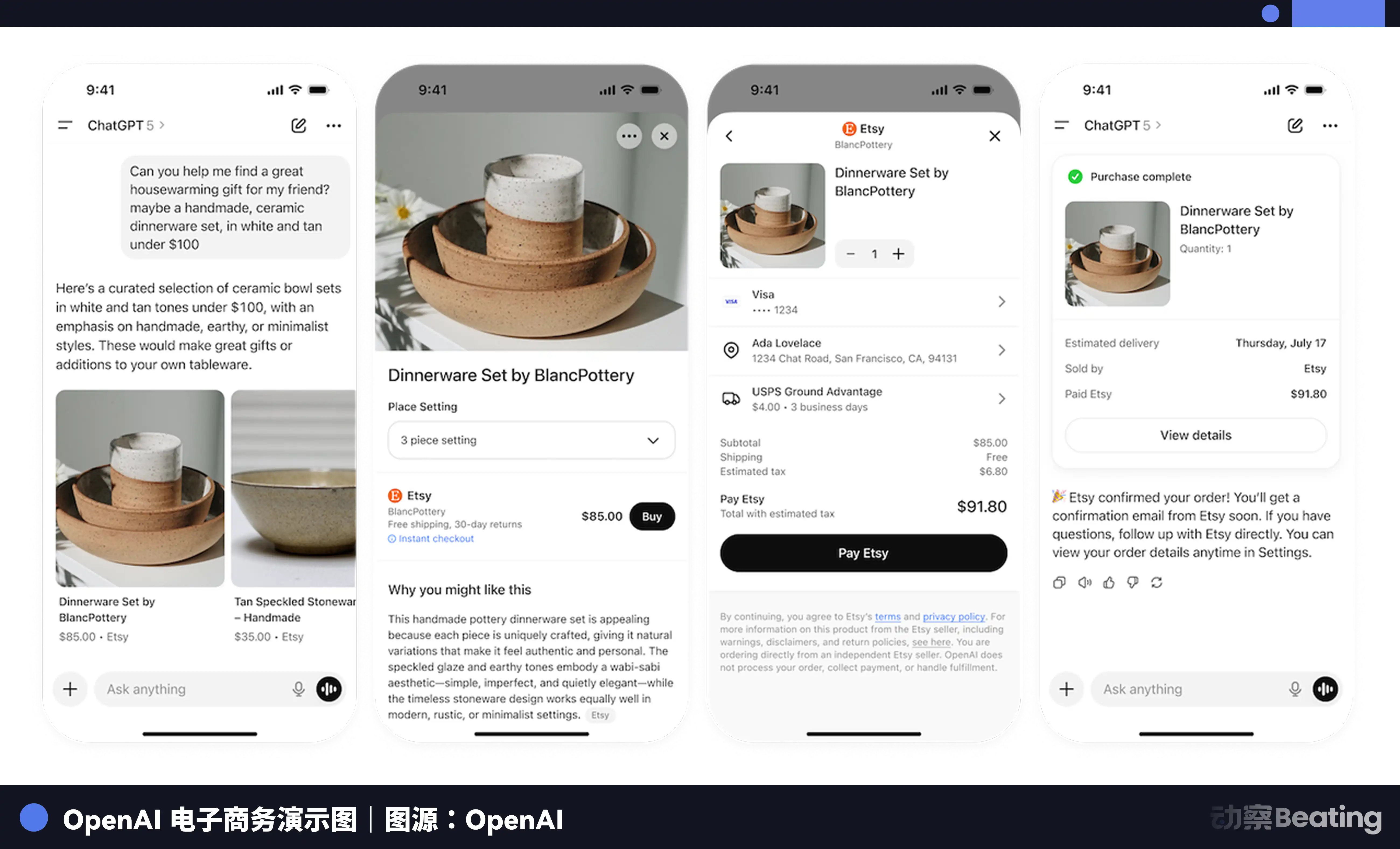 Shopify President Harley Finkelstein called it the new frontier of online retail. On the day of the announcement, Etsy's stock price jumped 16%. Partners quickly fell into place. Etsy made its sellers' products directly available in ChatGPT, even covering transaction fees for merchants to get the service online faster. Walmart listed around 200,000 products. PayPal planned to integrate its wallet into ChatGPT's checkout and, as part of the deal,承诺 increased purchases of OpenAI's API and enterprise ChatGPT plans. Stripe and OpenAI jointly developed the Agentic Commerce Protocol, attempting to set an industry standard for AI agent transactions.