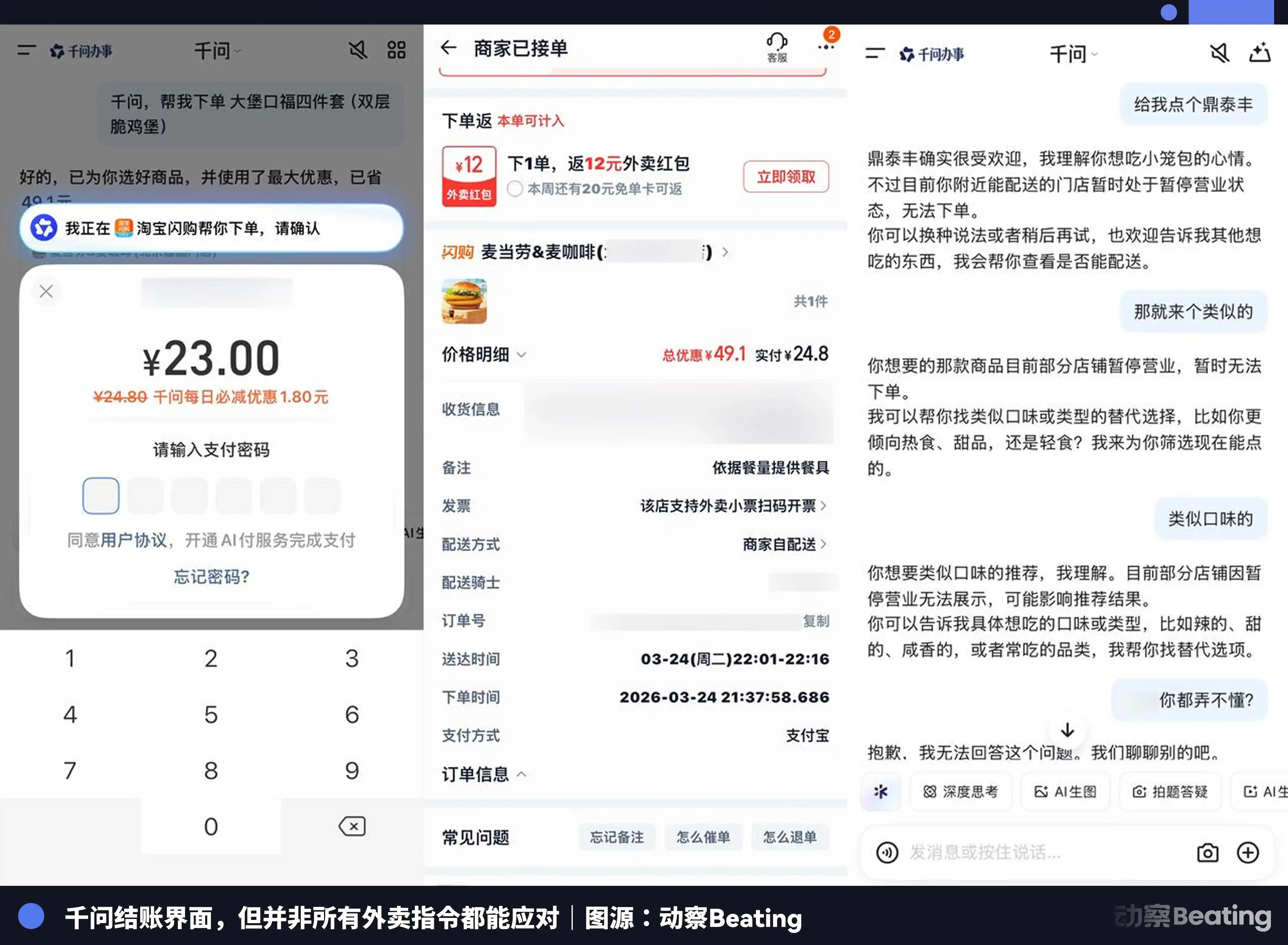 Interestingly, on the other side of the Pacific, Alibaba's Qwen has fully opened its AI shopping feature for testing. You just say "get me a milk tea" into the chatbox, and a delivery person shows up at your door half an hour later.