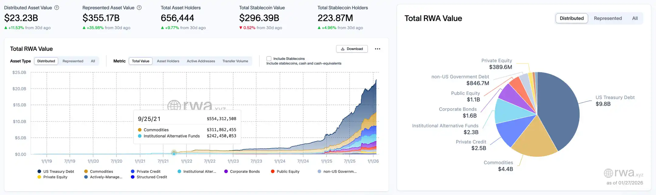 According to the rwa.xyz data panel, as of January 27, 2026, the total on-chain value of RWA (Distributed Asset Value) continued to rise steadily, growing from $216.6 billion on January 20 to $232.3 billion, a weekly increase of $7.6 billion, a growth rate of 3.51%. The size of the broad RWA market also saw a significant rebound, rising from $3.5008 trillion to $3.5508 trillion, an increase of $5 billion, a growth rate of 1.43%. The total number of asset holders increased from 637,807 to 656,444, a net increase of 18,637 people in a single week, an increase of 2.92%. Meanwhile, the stablecoin market maintained relatively stable growth, with the number of holders increasing from 223.34 million to 223.87 million, an increase of 0.23%; the stablecoin market capitalization rose slightly from $2.9964 trillion to $2.99964 trillion, an increase of 0.1%.