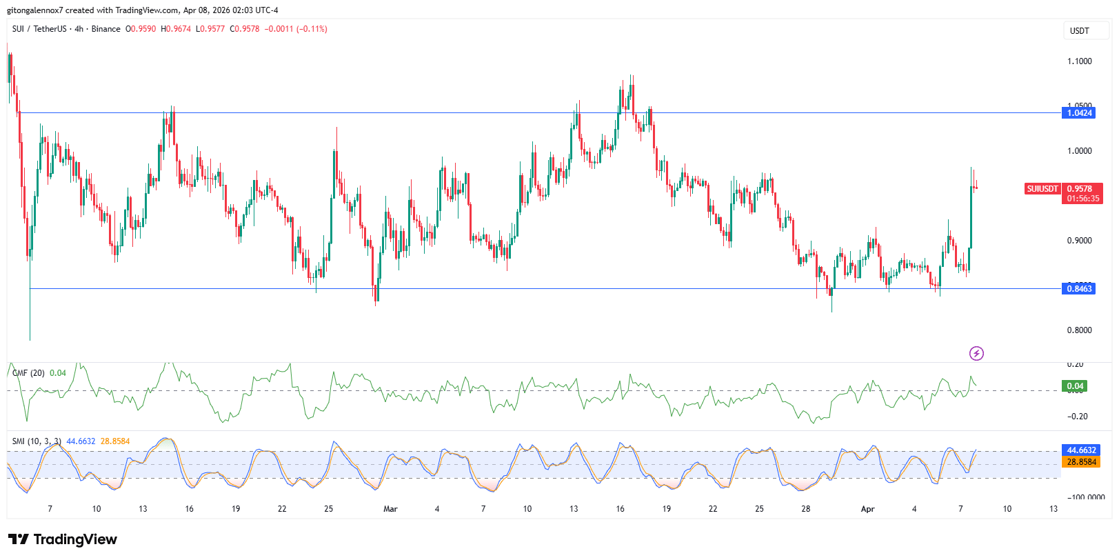 SUI bounced off a support level within a sideways consolidation that began in the first week of March. SUI’s price is trading toward the top of the range at $1 from around the $0.84 zone. However, it’s facing resistance at $0.96, which could be a hurdle going up.