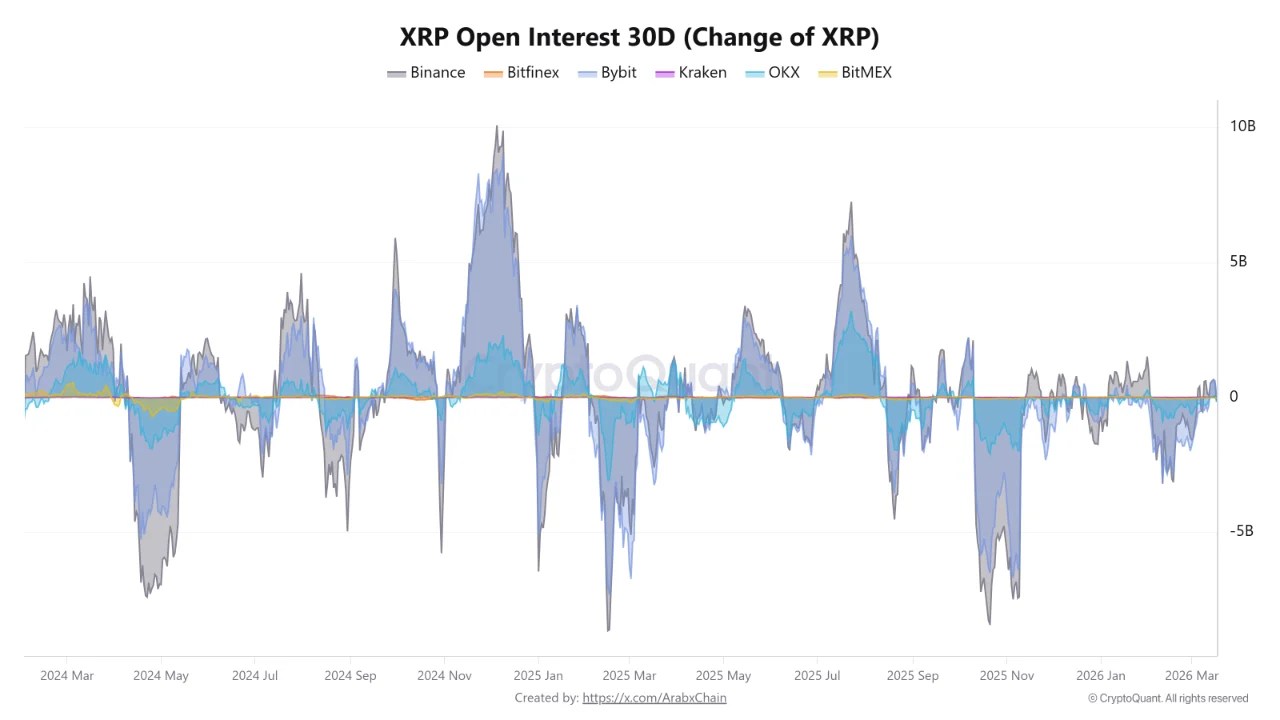 Beyond price action, derivatives data is revealing a more complex and reactive market structure. According to CryptoQuant analyst Arab Chain, the XRP Open Interest 30-day change indicator highlights significant fluctuations in how traders are positioning across derivatives markets. The data shows repeated shifts between positive and negative readings, pointing to a highly sensitive environment driven by leverage and short-term speculation.
