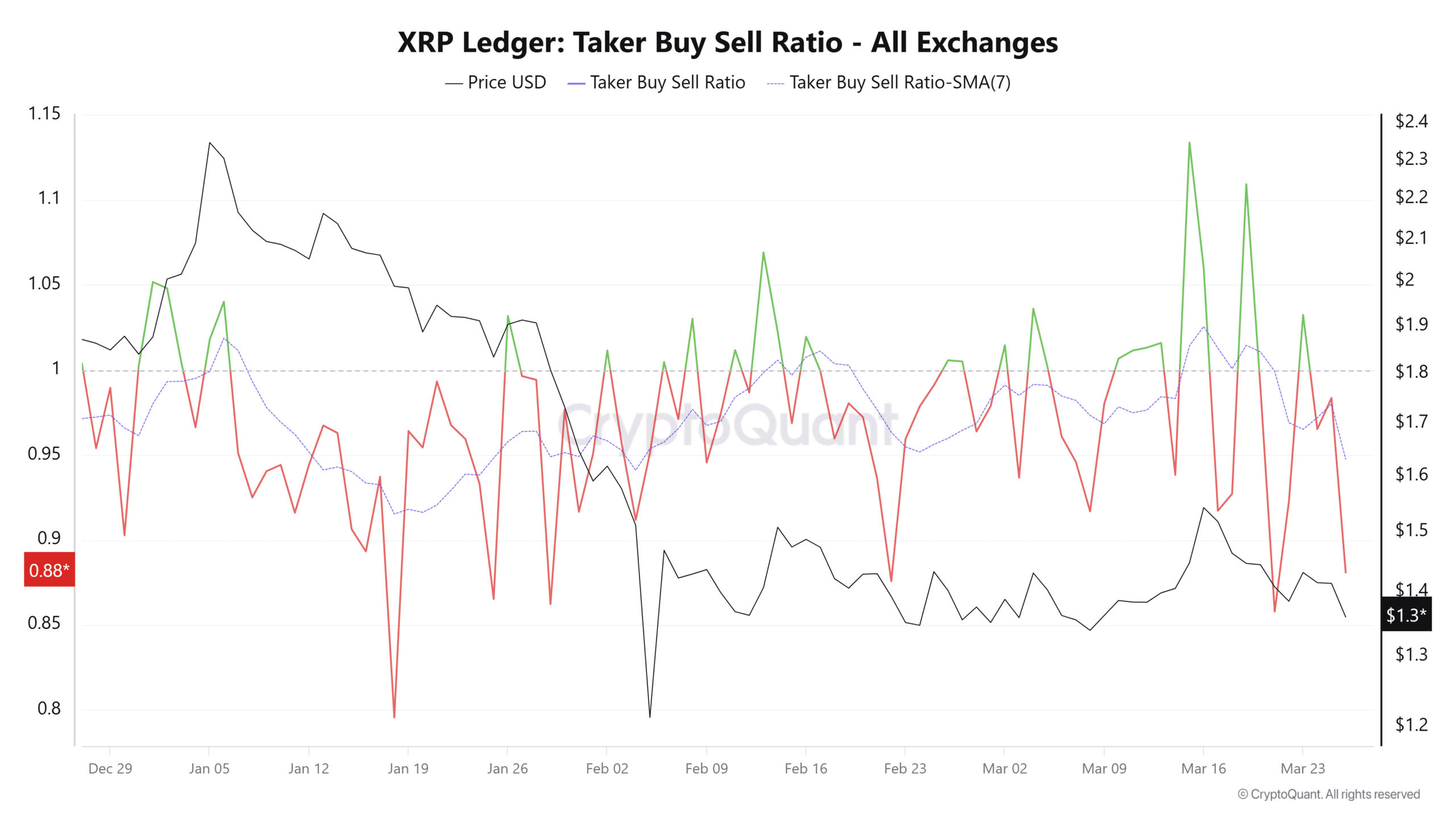 The Taker Buy-Sell Ratio was examined to understand the buyer aggression. In mid-March, when XRP rallied to $1.54 when Bitcoin reached $75k, the taker buy orders were prevalent. The 7-day moving average of the taker Buy/Sell Ratio climbed above 1 and stayed there for a few days, something that has only happened thrice in 2026.