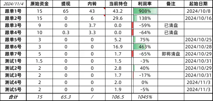 Last week, after introducing the in-depth evaluation system, the stability of Copy Trading Accounts 1 and 2 significantly improved, beginning to provide sustained funding support for other test accounts. Furthermore, Copy Trading Account 6 achieved a nearly 5x increase in one week.