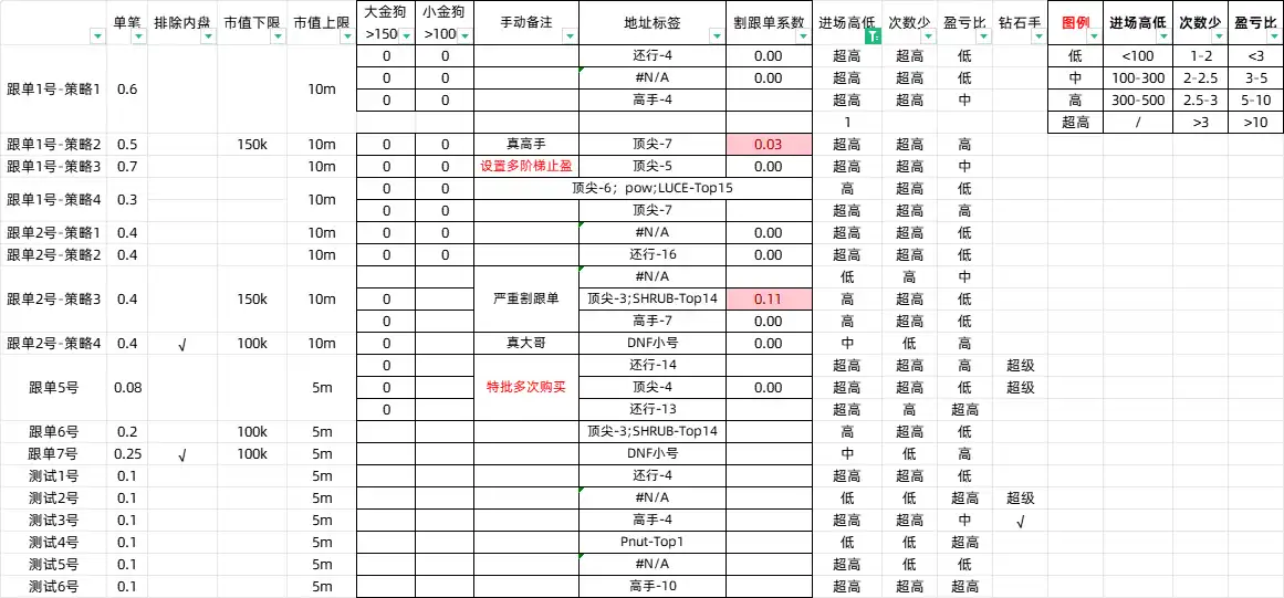 - The left column is the strategy column, with different settings based on the wallet's profitability, purchase frequency, and on-premises market (Pump.fun) profitability.