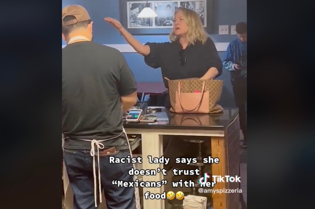 “This lady walked into our pizza shop (owned by hispanics) and heard Spanish coming from our TV and started discriminating [against] us. Not all Spanish speakers are Mexican and it was bold of her to assume so,” Amy’s Pizza wrote in a caption on the viral video.