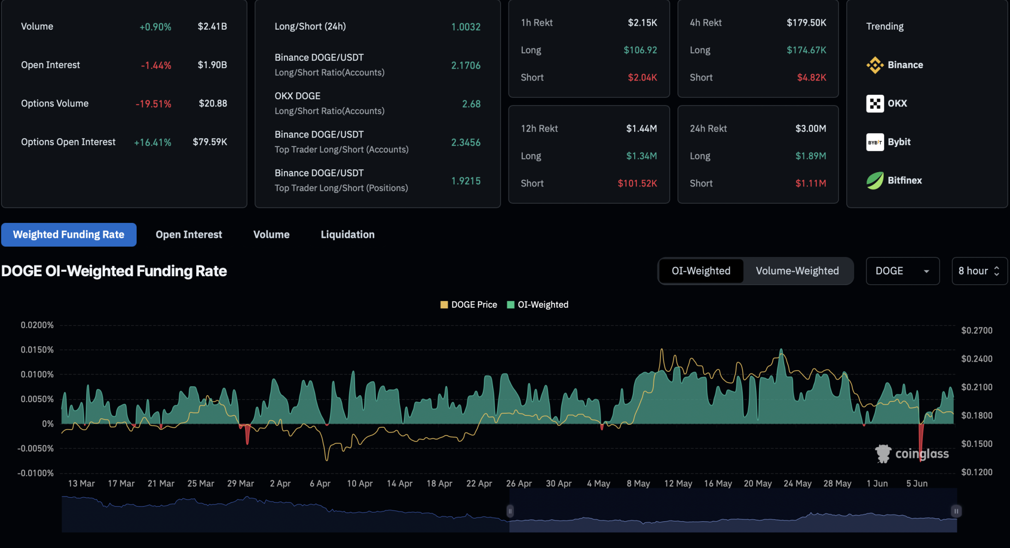 随着狗狗币处于关键时刻,衍生品市场的乐观情绪似乎正在消退。据 CoinGlass 称,未平仓合约已下降 1.44%,降至 19 亿美元。