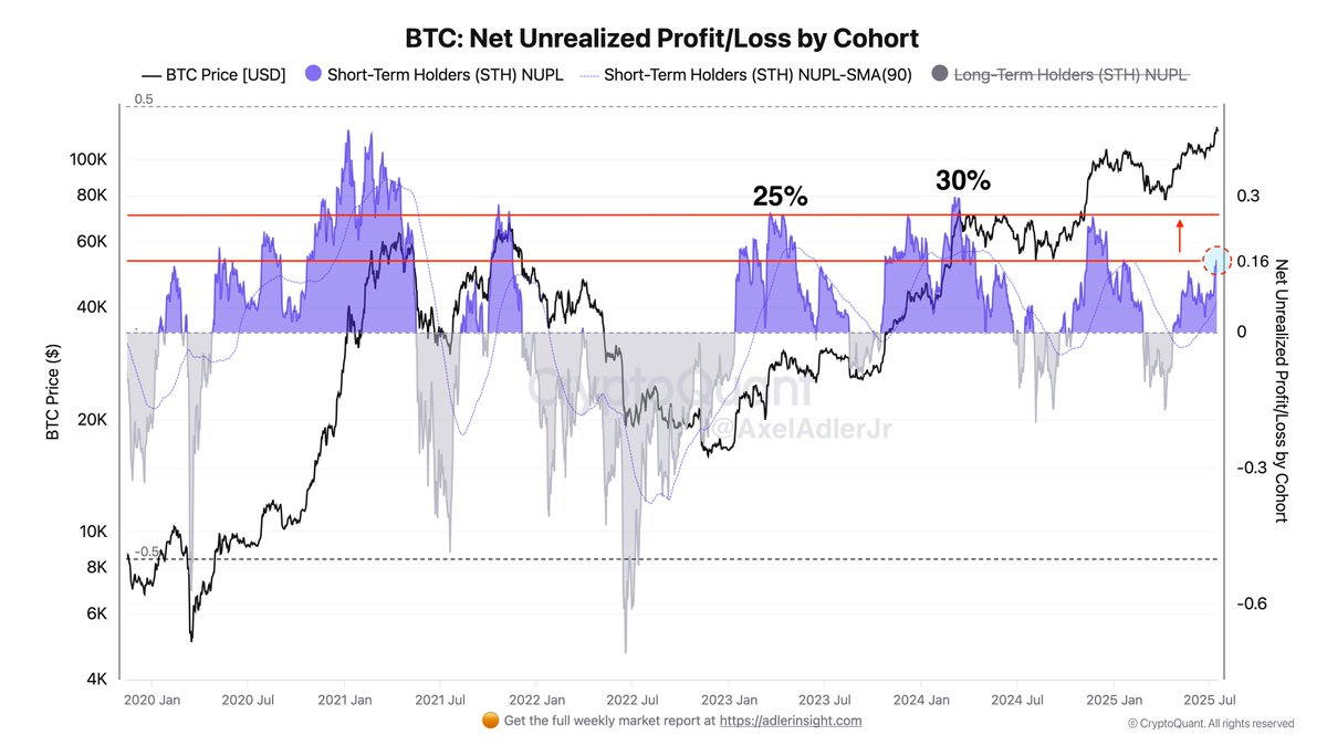 Today, as of July 17, 2025, STH NUPL stands at 13% (compared to 16% at the level of the last ATH), indicating moderate unrealized profit among this cohort and the absence of signs of market overheating.