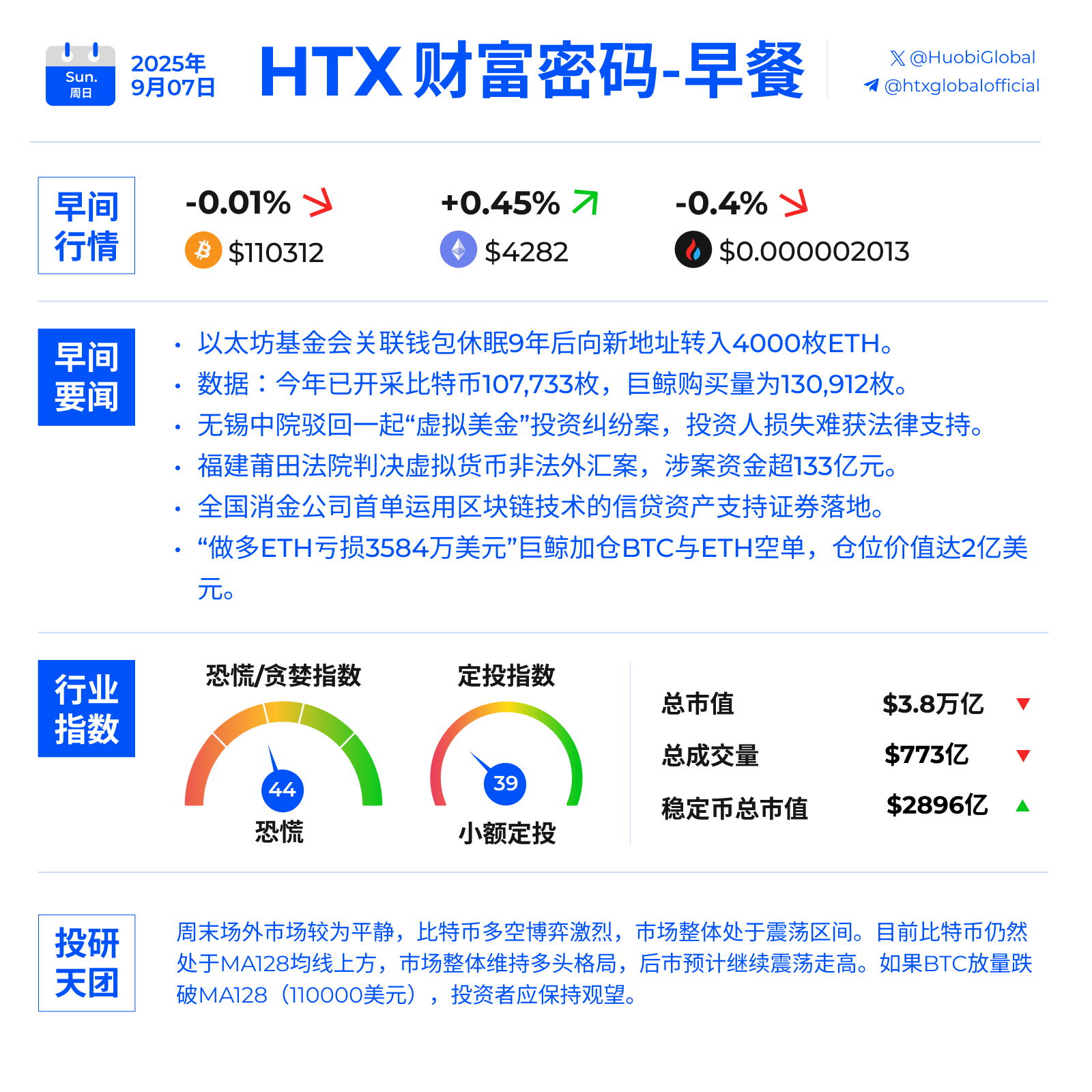 今日市场动态亮点:以太坊基金会关联钱包休眠9年后向新地址转入4000枚ETH。