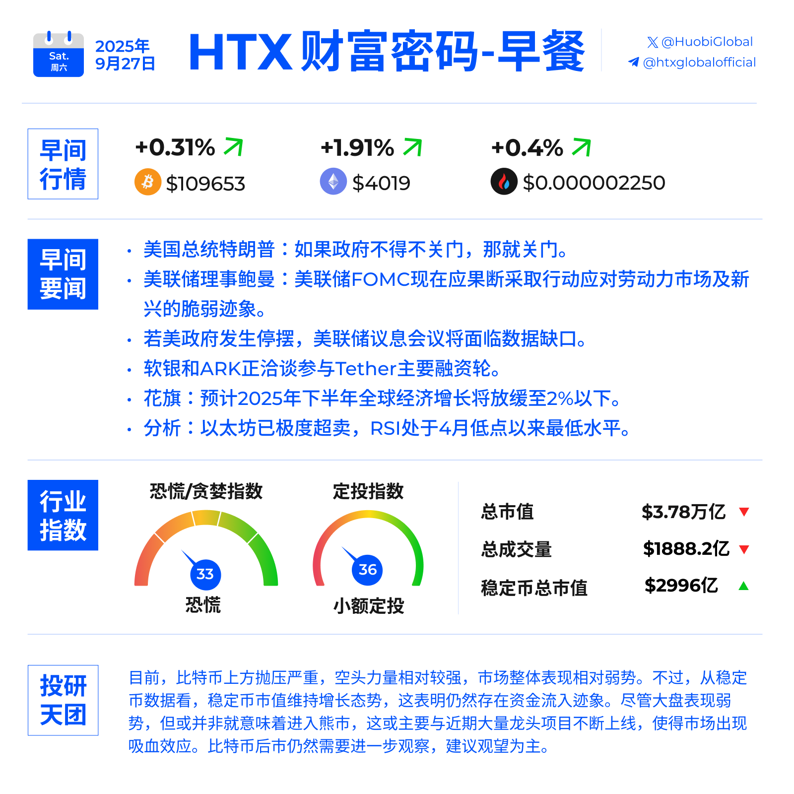 今日市场动态亮点:软银和ARK正洽谈参与Tether主要融资轮;花旗预计2025年下半年全球经济增长将放缓至2%以下。