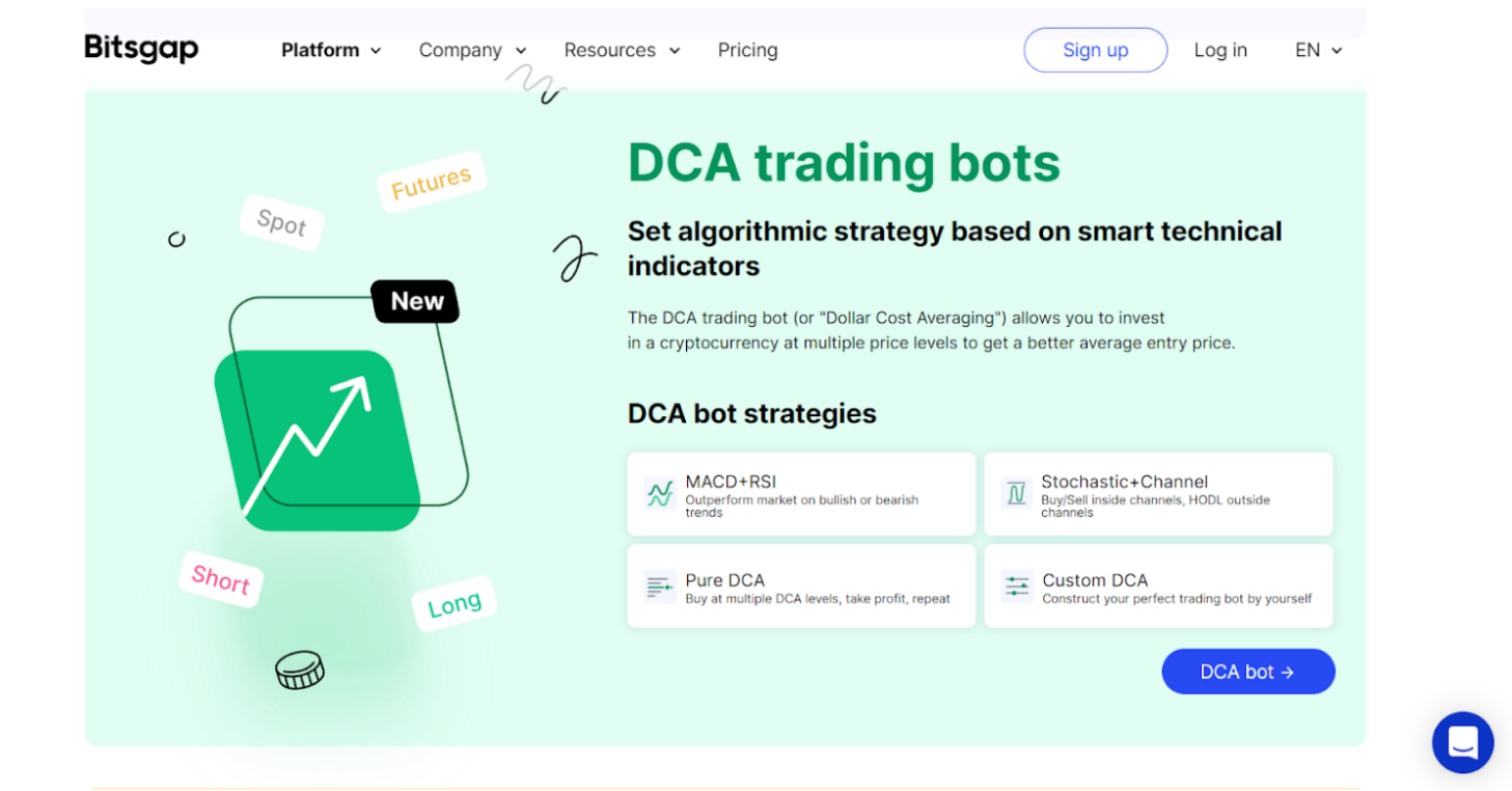 Meanwhile, Bitsgap is among the first crypto trading bots to add advanced versions of this strategy: besides "Pure DCA" and "Custom DCA" options, it has the opportunity to enhance DCA purchases using MACD+RSI and Stochastic+Channel, two reliable tech analysis indicators.