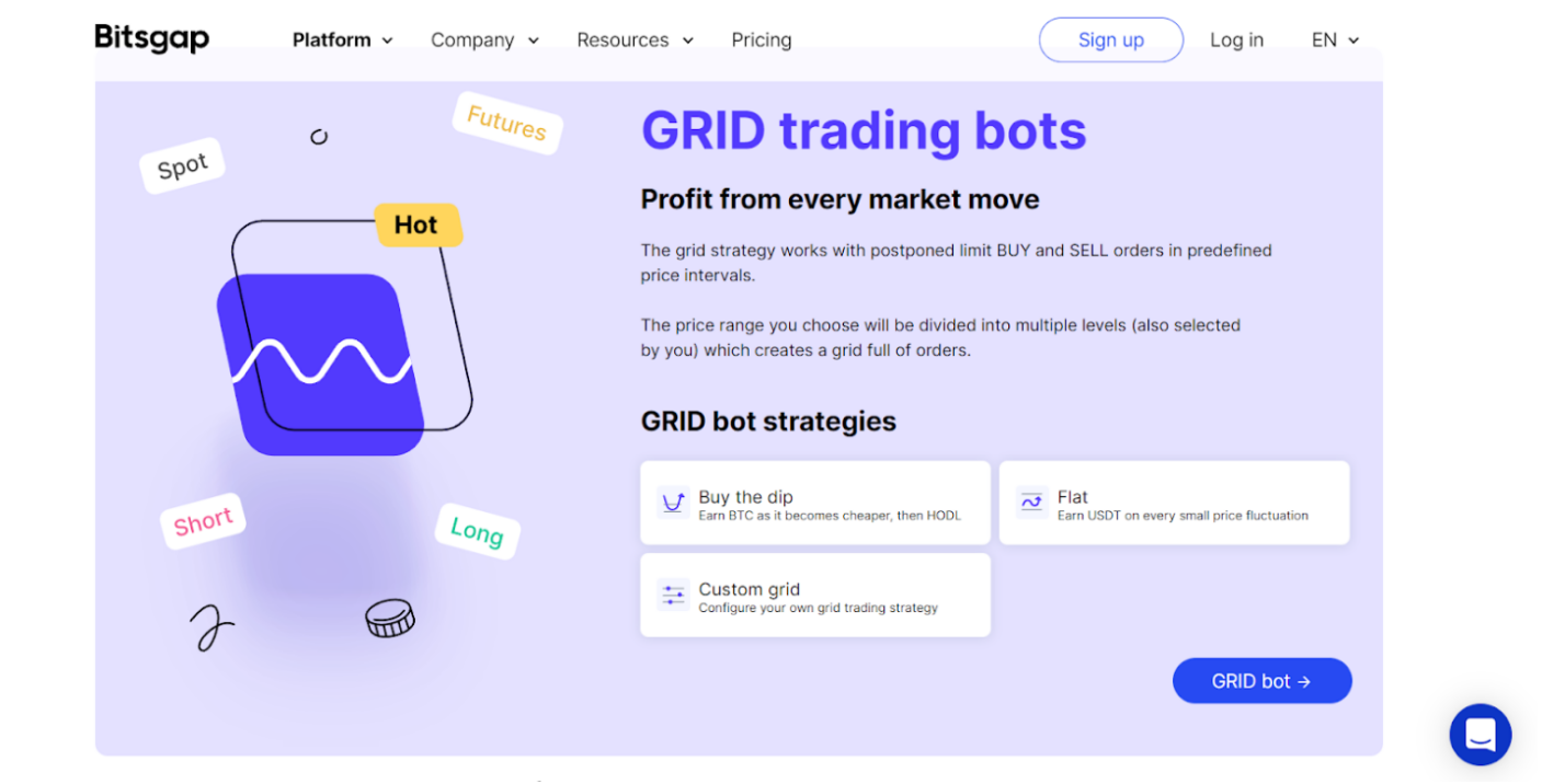 Grid trading bot by Bitsgap is a classic solution: it allows users to set up a price interval and make the bot "buy low, sell high" within this interval. Also, Bitsgap grid bots can buy Bitcoin (BTC) on every dip or take small U.S. Dollar Tether (USDT) profits on price fluctuations in both directions.