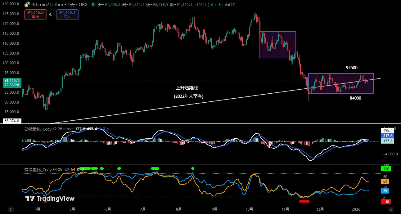 1、上周明确指出:重点观察84,000~94,500美元区域的得失。在未有效突破区域上下沿之前,币价将维持区间震荡格局。