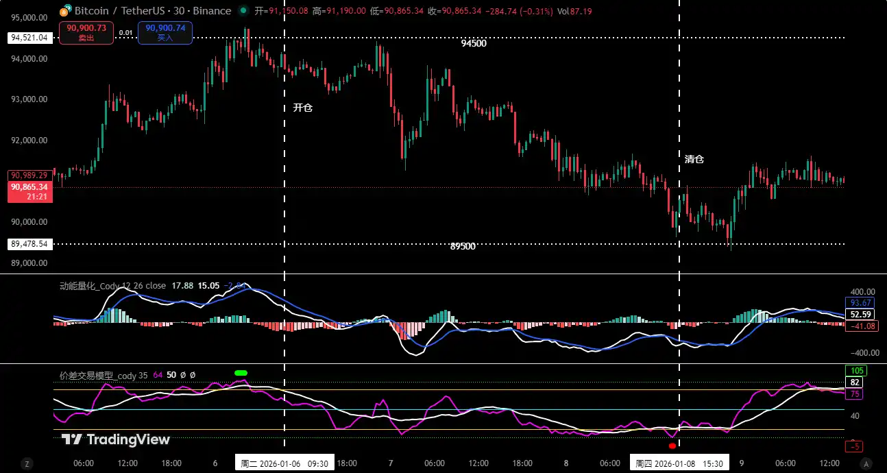 • 交易(盈利 3.4%):本次操作完美执行了“压力位遇阻沽空”策略:第一步,当币价上行冲击94,500美元关键阻力位时,与价差交易模型的顶部信号(绿点)形成共振,我们果断入场建立 30%空头仓位;第二步,待币价回落至目标支撑区并触发模型底部信号(红点)后,我们顺势平仓,锁定收益。
