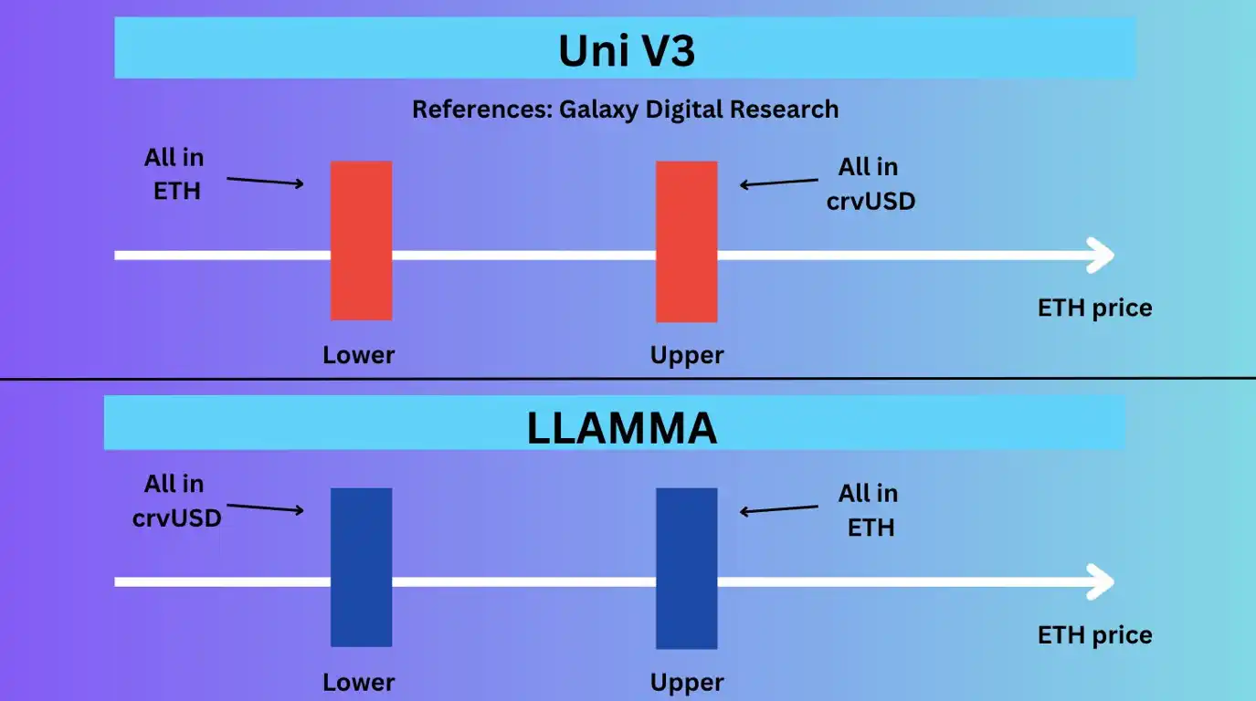 LLAMMA 的 AMM 的设计方式是,AMM 中的价格(红色)下降/上升的速度快于 Uniswap 中的价格(蓝色)。当 Uniswap 中的 ETH 价格下跌时,AMM 中的 AMM 价格下跌得更快,这为套利者偿还 crvUSD 和交换 ETH 抵押品创造了机会。