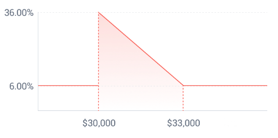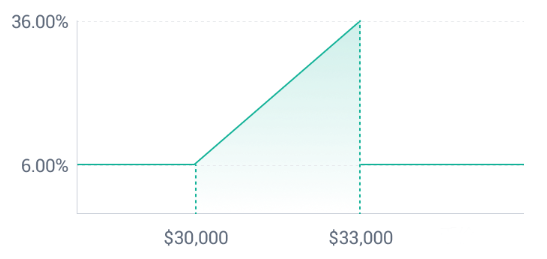 APY = 36% - (31,000 - 30,000) / (33,000 - 30,000) × (36% - 6%) = 26%