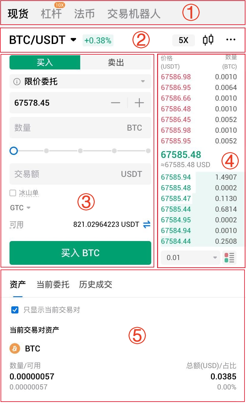 4. 买卖盘口。此处会实时当前市场的挂单和成交情况,下方为买盘,上方为卖盘,中间为实时成交价格。