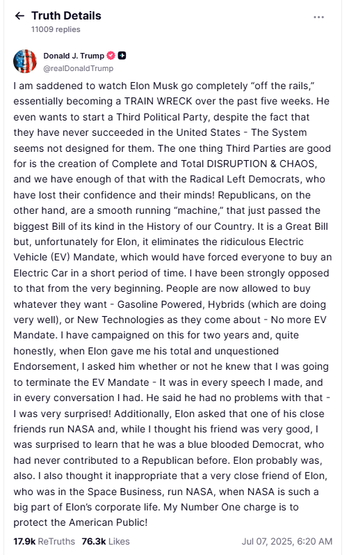 马斯克曾发文十7 月 5 日,他表示希望推出“美国党。”特朗普于 7 月 6 日予以回击,称此举表明马斯克“完全‘脱轨’,本质上变成了一个“火车失事”在过去的五周里。”