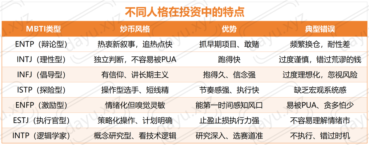 不同人格在投资中的特点,看了一下还挺准,我是INTJ,确实比较跑得快,山寨币\MEME币在我心里价值全是0,宁愿少赚、不赚,也不想亏钱。大家对照一下自己的人格看准不准,当然,最重要的针对自己的短板,反过来思考一下。这波 $ZEC 纳威尔喊单没上,过度谨慎。测试点此