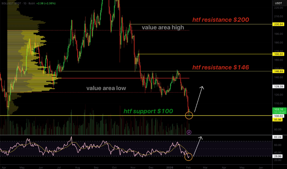 RSI below 30 signals extreme oversold conditions and bounce potential. Any rally toward $146 is likely corrective unless structure and value are reclaimed. Solana price has undergone a sharp and aggressive downside move, placing the asset firmly under bearish pressure across multiple timeframes. The recent decline has been characterized by impulsive selling, weak countertrend bounces, and a clear loss of bullish market structure. As price accelerated lower, Solana invalidated several key technical levels, confirming that sellers remain in control of the broader trend. While the overall structure remains weak, the current $100 test is occurring under materially different conditions, with momentum indicators now reflecting extreme exhaustion. This increases the likelihood of a short-term relief rally before the next major directional move unfolds.