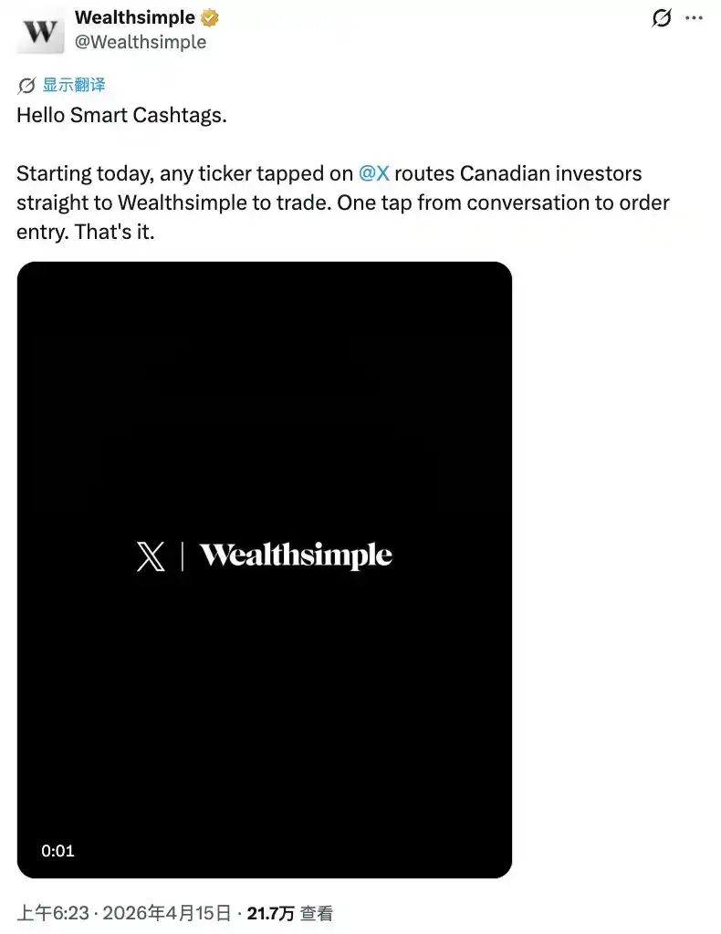 La fonctionnalité Cashtag a été lancée en premier aux États-Unis et au Canada, mais seuls les utilisateurs canadiens peuvent cliquer sur un Cashtag pour être redirigés directement vers un courtier pour passer un ordre. La raison est simple : Wealthsimple est une entreprise canadienne, donc le lancement a eu lieu au Canada. Le partenaire de transaction pour le marché américain n'a pas encore été annoncé. Mais la question intéressante est : pourquoi Wealthsimple, et pas d'autres institutions financières canadiennes ?