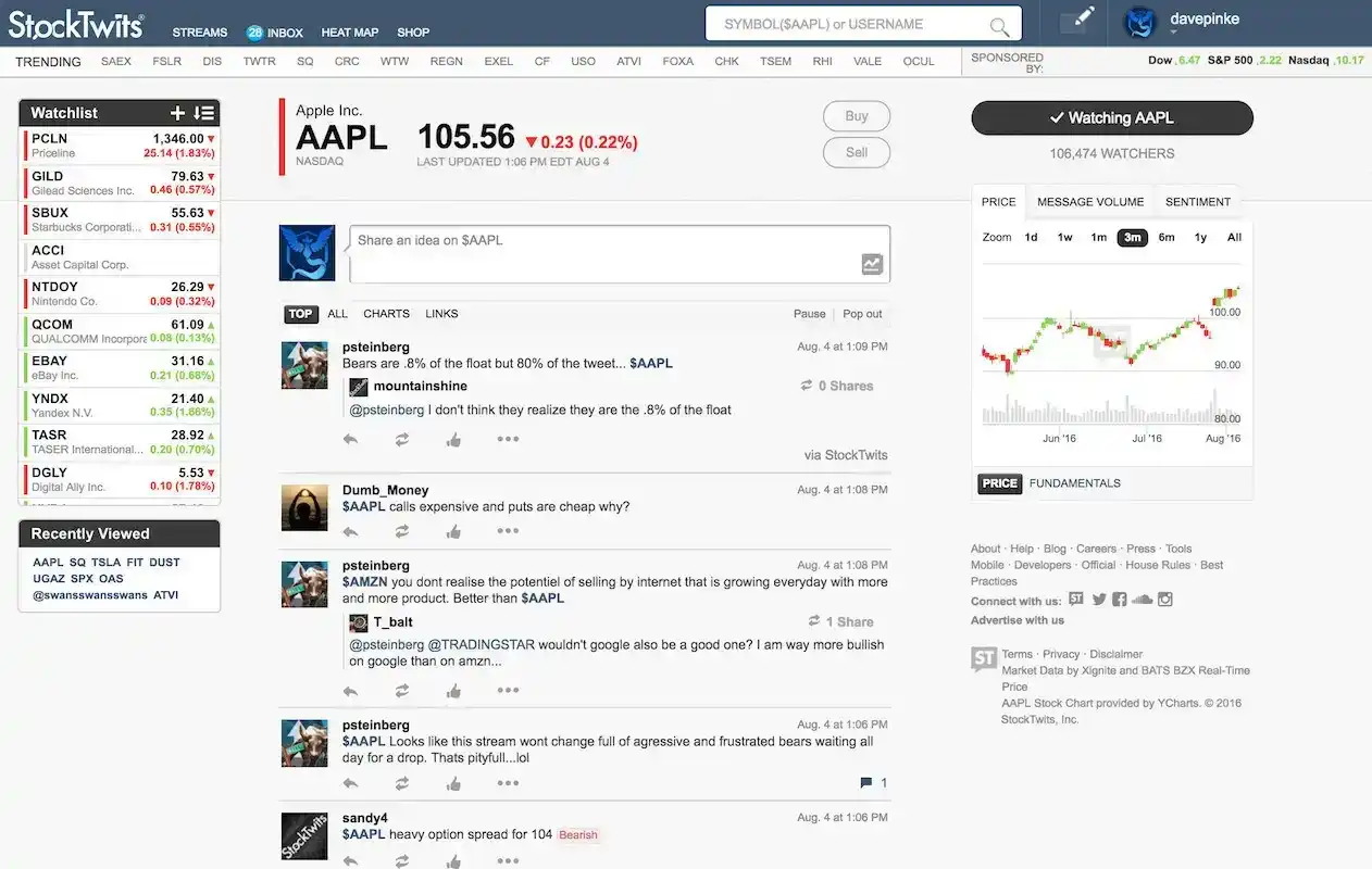 En 2008, un analyste financier et business angel nommé Howard Lindzon a créé StockTwits, une plateforme sociale dédiée aux investisseurs. Il y a introduit des symboles comme $AAPL, utilisant le signe $ pour transformer les tickers boursiers en hashtags cliquables, permettant aux investisseurs particuliers de discuter autour d'actifs spécifiques et de suivre le sentiment du marché. Il a nommé cette conception : cashtag.