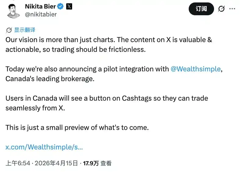 Le responsable produit de X, Nikita Bier, a spécifiquement souligné un point lors du lancement : X ne jouera pas le rôle de courtier et n'exécutera pas directement les transactions. Le positionnement de X est celui d'un « niveau de données et de découverte ». Il est responsable de la présentation de l'information, de l'agrégation des discussions et de la guidance des utilisateurs, tandis que l'exécution réelle des ordres est confiée à des courtiers tiers.