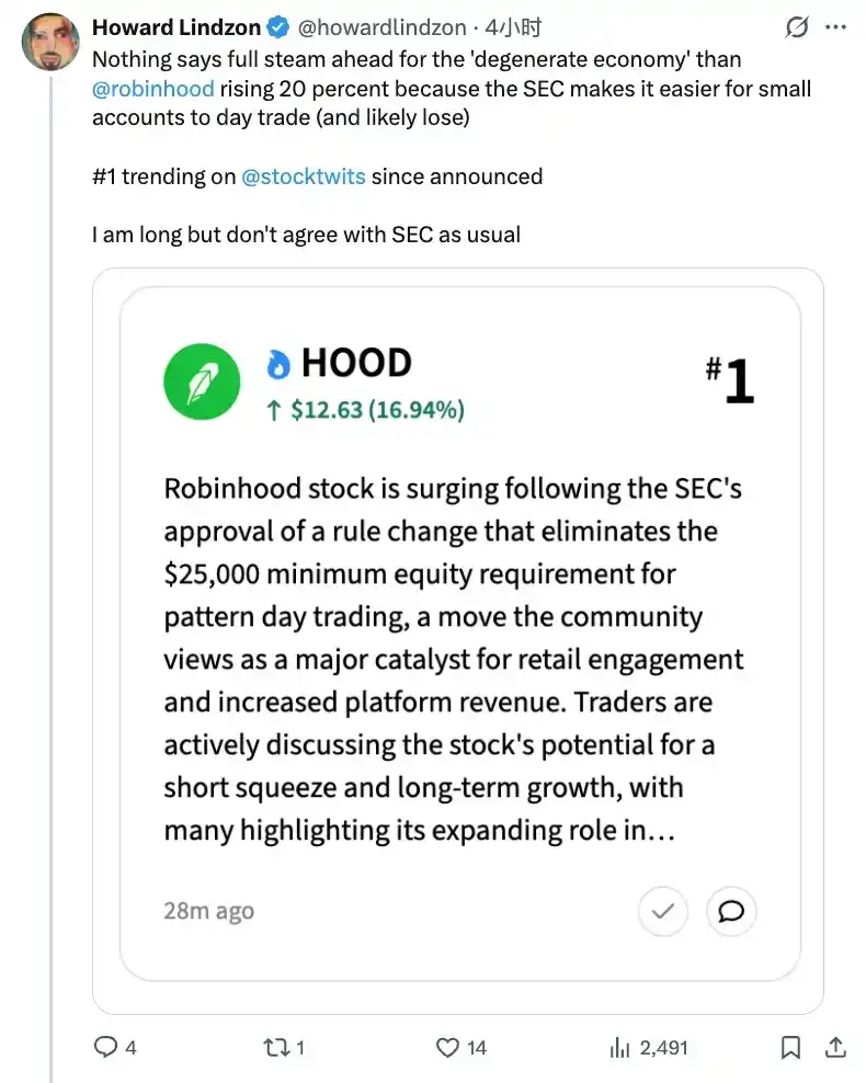 Le 14 avril 2026, Lindzon a publié un tweet sur sa page X principale, faisant la promotion des Cashtag Awards 2026 que StockTwits organiserait prochainement à la Bourse de New York.