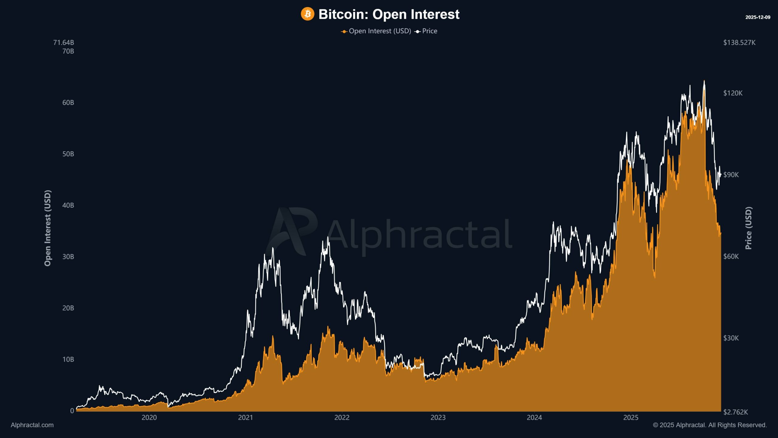 Selon Joao Wedson, PDG d'Alphractal, l'Open Interest agrégé en USD a atteint de nouveaux sommets ce cycle, grimpant au-delà de 70 milliards de dollars au plus haut.