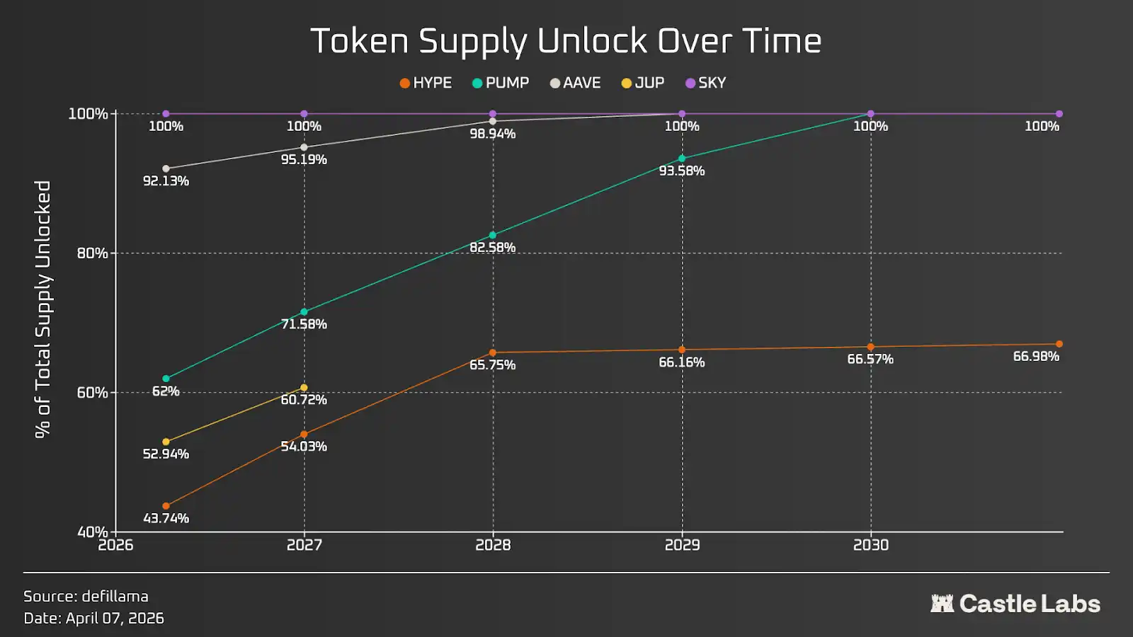 Le graphique ci-dessous montre la vitesse de déblocage de l'offre pour une série de jetons à offre fixe. Bien que la plupart des jetons finissent par être entièrement débloqués, la vitesse de déblocage varie considérablement : PUMP se débloque le plus rapidement, tandis que HYPE se débloque le plus lentement. Généralement, une vitesse de déblocage plus lente est préférable, car elle réduit la possibilité d'un choc soudain de l'offre et de la pression de vente qui en résulte que le marché pourrait avoir du mal à absorber. Pour des jetons comme AAVE et SKY, la majeure partie de l'offre est déjà débloquée ; tandis que pour JUP, le plan de déblocage à long terme est discrétionnaire plutôt que déterministe, géré par le DAO.