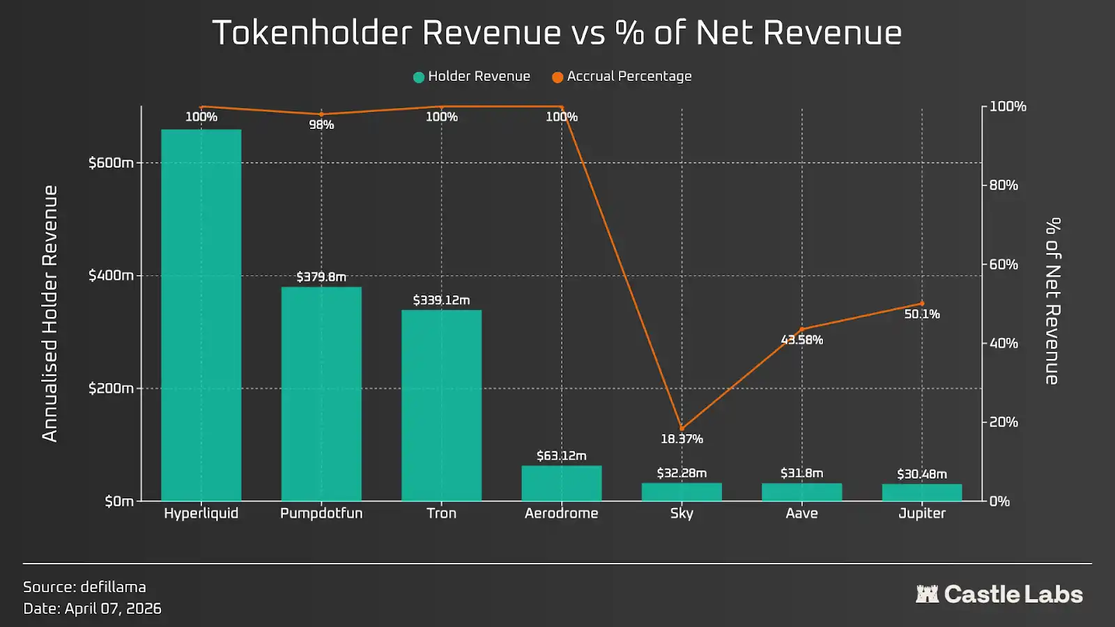 Le prochain facteur important à discuter est le rendement pour les détenteurs de jetons. Cela dépend principalement des revenus du protocole, et de la partie réellement retournée aux détenteurs de jetons via des rachats, des brûlages de jetons et des récompenses de staking, entre autres. Aujourd'hui, le rendement pour les détenteurs est devenu un indicateur populaire, dont presque tout le monde parle, et il est plus important que les revenus réels, car c'est de cette manière que la valeur du jeton s'accumule.