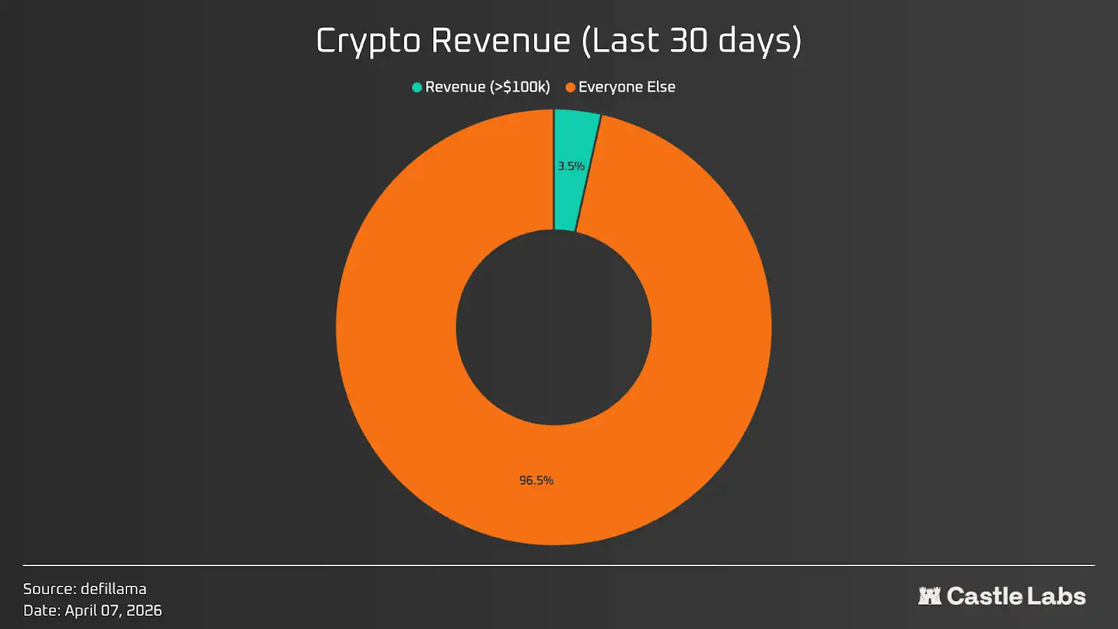 DeFillama répertorie environ 5700 protocoles ; si on inclut les protocoles ou produits ayant généré plus de 100 000 $ de revenus au cours des 30 derniers jours, il n'y en a qu'environ 200, soit 3,5 %. Le bassin d'investissement cryptographique est plus petit que prévu. La plupart des jetons n'ont pas de valeur d'investissement.