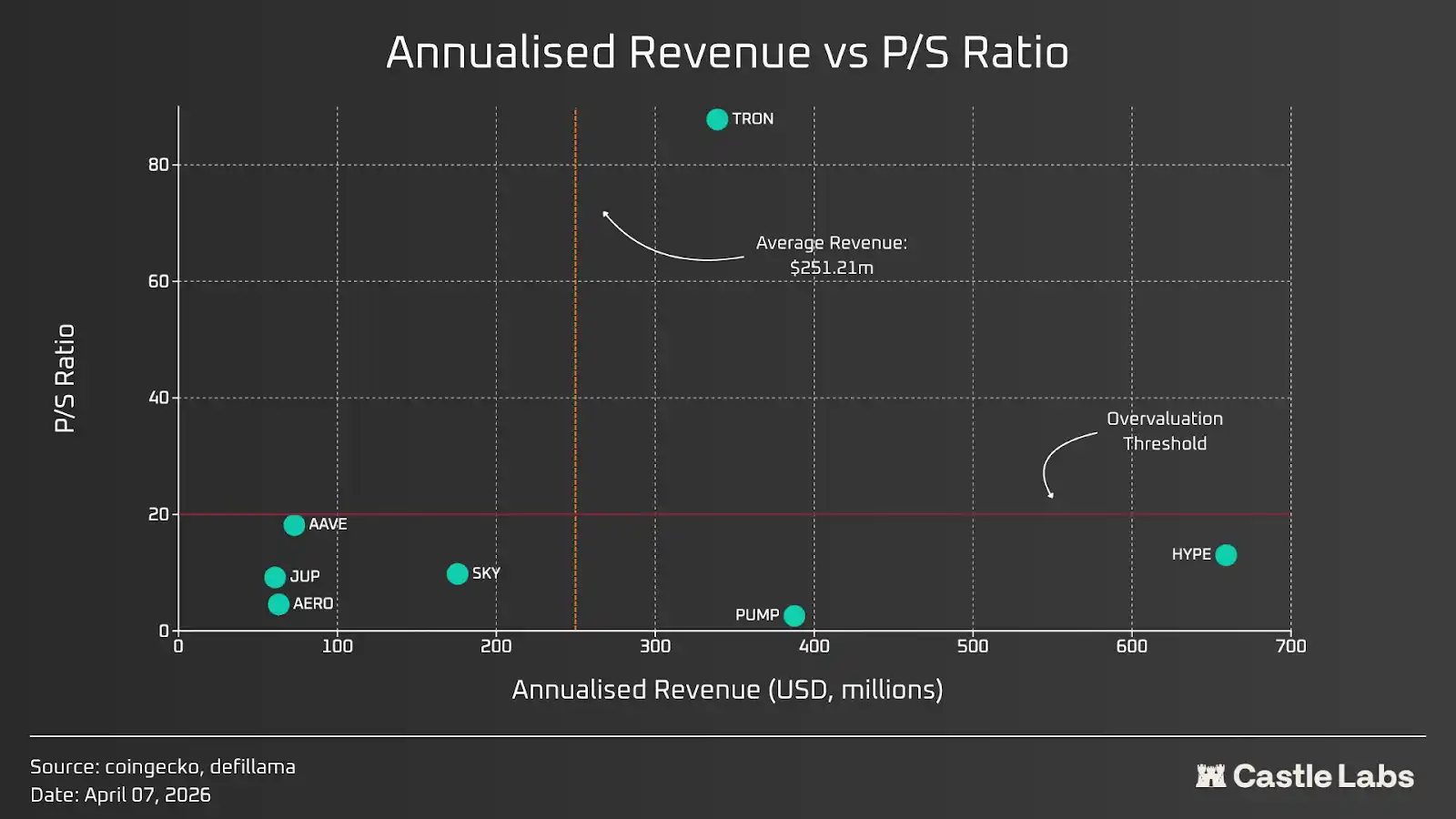 Nous avons fixé le seuil de surévaluation à 20 en nous basant sur le ratio prix/ventes (P/S) des principales actions américaines cotées. La plupart des protocoles ont un ratio P/S proche ou inférieur à ce seuil, seul Tron ayant un ratio P/S bien supérieur aux autres. Un autre seuil que nous avons considéré est celui des revenus, en prenant le revenu annualisé moyen d'environ 250 millions de dollars. Seuls trois protocoles, Pump.fun, Hyperliquid et Tron, dépassent ce seuil, représentant ensemble environ 80 % des revenus totaux des protocoles mentionnés ci-dessus.