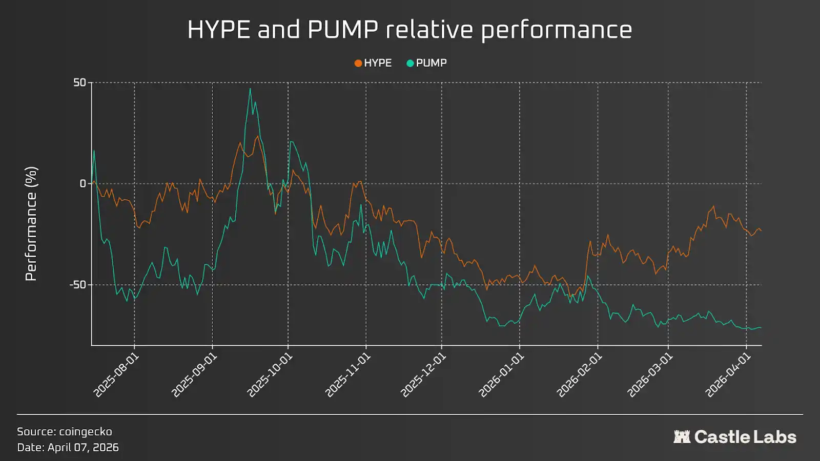 Cela indique que les rachats seuls ne suffisent pas à augmenter la valeur du jeton ; d'autres facteurs, comme un repli plus large du marché, les plans de déblocage de jetons et les déblocages en cliff, les perspectives du marché pour le récit du secteur, et le sentiment général autour du protocole, jouent également un rôle. Tous ces facteurs seront discutés dans les sections suivantes. Avant cela, comparons les deux protocoles aux revenus les plus élevés et la performance de leurs jetons : Pumpd.fun et Hyperliquid. Le graphique ci-dessous montre que lorsque les deux jetons ont des programmes de rachat actifs, HYPE performe mieux (le rendement annualisé pour les détenteurs de HYPE est d'environ 660 millions de dollars, contre environ 380 millions de dollars pour PUMP), en raison du bon sentiment général du marché autour de ce protocole et du fait que les gens fixent le prix du jeton en fonction des chocs d'offre futurs et des déblocages.