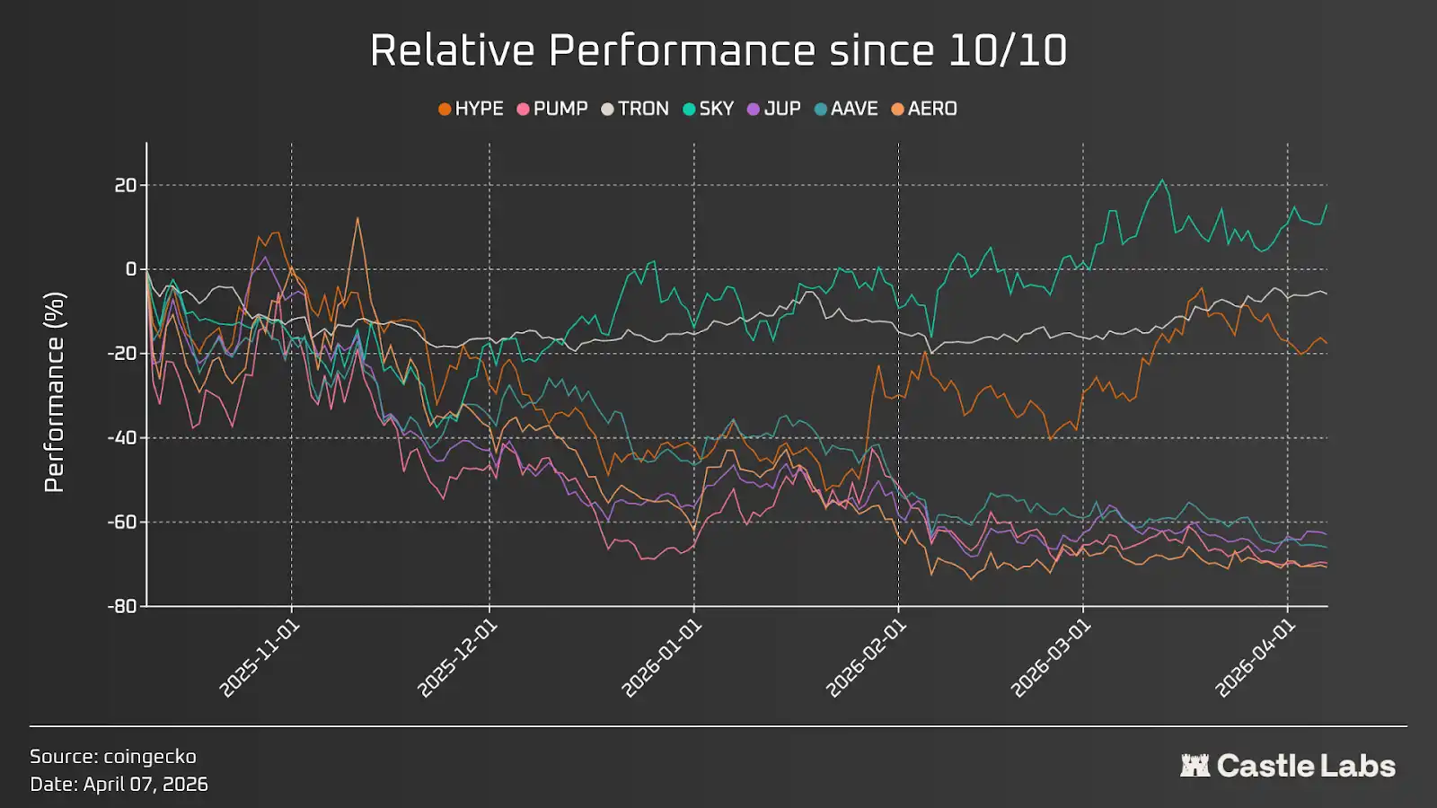 Ce n'est qu'un aspect, cela reflète le fait que des rachats de jetons sont en cours, et s'ils se poursuivent à un rythme similaire, ils ajouteront des millions de dollars de valeur au jeton. Pour mieux comprendre cette accumulation de valeur, nous comparons également la performance relative de ces jetons après l'événement de liquidation d'octobre, pour montrer plus clairement l'impact des activités de valorisation des jetons.