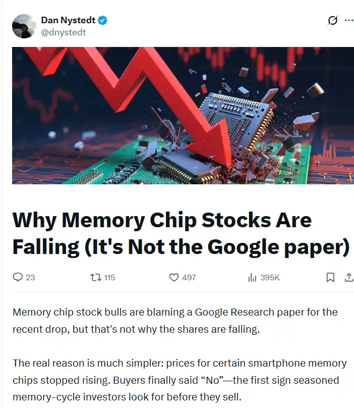 Pour les traders suivant les cycles traditionnels, la chute du marché n'est pas si simple. Dan Nystedt, ancien journaliste et célèbre analyste semi-conducteurs basé à Taïwan, souligne que de nombreux optimistes attribuent la récente chute violente à l'article de Google, mais ce n'est que la surface. Dan pense que la véritable raison réside dans le fait que le prix de certaines puces mémoire pour smartphones a cessé d'augmenter.