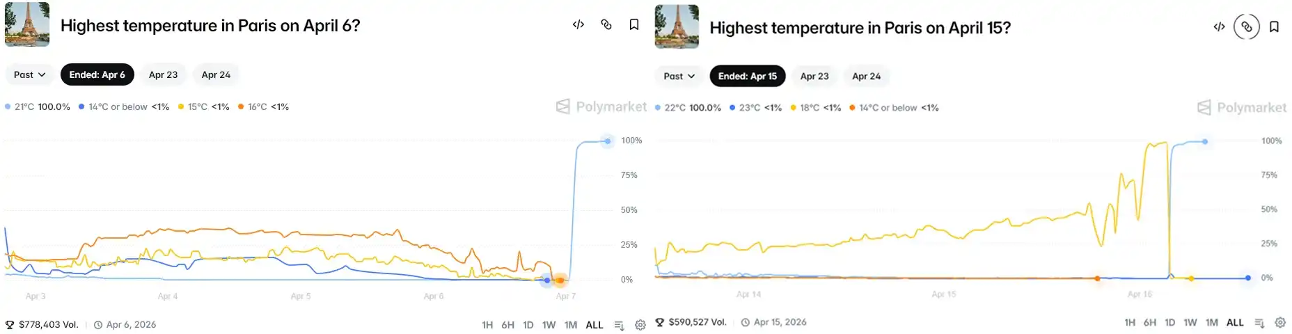 Selon le journal français Le Monde, les 6 et 15 avril, les capteurs météorologiques de l'aéroport de Paris-Charles-de-Gaulle ont présenté deux anomalies successives : la température a grimpé de plus de 3°C en quelques minutes avant de redescendre, comme si rien ne s'était passé. À chaque anomalie, quelqu'un avait parié à l'avance sur l'intervalle de température improbable correspondant sur Polymarket, emportant au total environ 34 000 dollars à partir d'une mise initiale de quelques dizaines de dollars. Le compte ayant placé le premier pari avait été créé seulement deux jours avant l'anomalie.