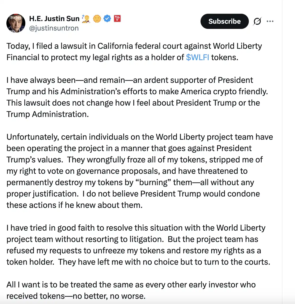 Le 22 avril, le fondateur de Tron a officiellement poursuivi World Liberty Financial devant le tribunal fédéral de San Francisco, l'accusant de l'avoir "ciblé comme principale victime de son plan frauduleux", lui et ses entreprises ayant subi "des pertes de plusieurs centaines de millions de dollars". Il accuse également WLF d'être actuellement "au bord de l'effondrement" et "lourdement insolvable", et de prévoir de "verser 95 % des bénéfices de la vente de jetons à des initiés de l'entreprise".