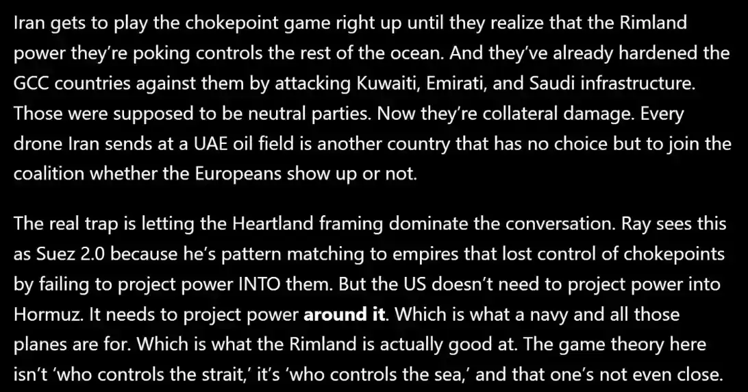 Cela explique aussi le fossé entre Washington et Bruxelles. Les États-Unis ressentent le poids de la responsabilité ; l'Europe semble croire qu'elle peut négocier en secret des accès énergétiques tout en laissant le « grand frère » payer le prix du conflit. La France a bloqué une résolution au Conseil de Sécurité tout en négociant des arrangements bilatéraux pour le passage dans le détroit et en appelant à une « coalition de nations indépendantes ». C'est une pensée typique du « heartland » : commercer avec les puissances continentales, éviter le conflit direct, comme si les voies maritimes se maintenaient d'elles-mêmes.