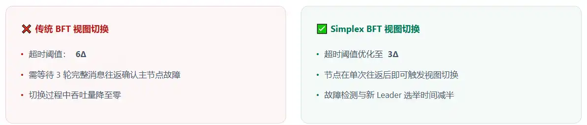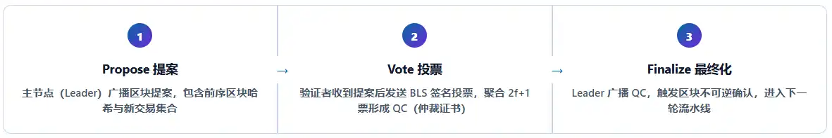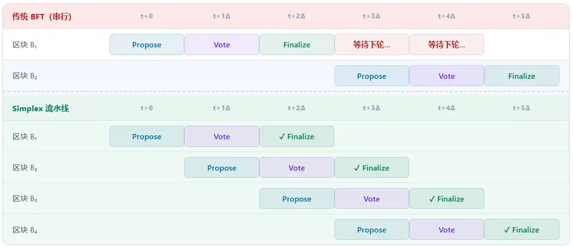 Clé de l'amélioration des performances : En mode pipeline, la phase Propose de B2 se chevauche avec la phase Vote de B1. Chaque tour n'a besoin d'attendre que 1Δ pour passer à la proposition du bloc suivant, alors que le BFT traditionnel nécessite une attente série complète de 3Δ par tour.