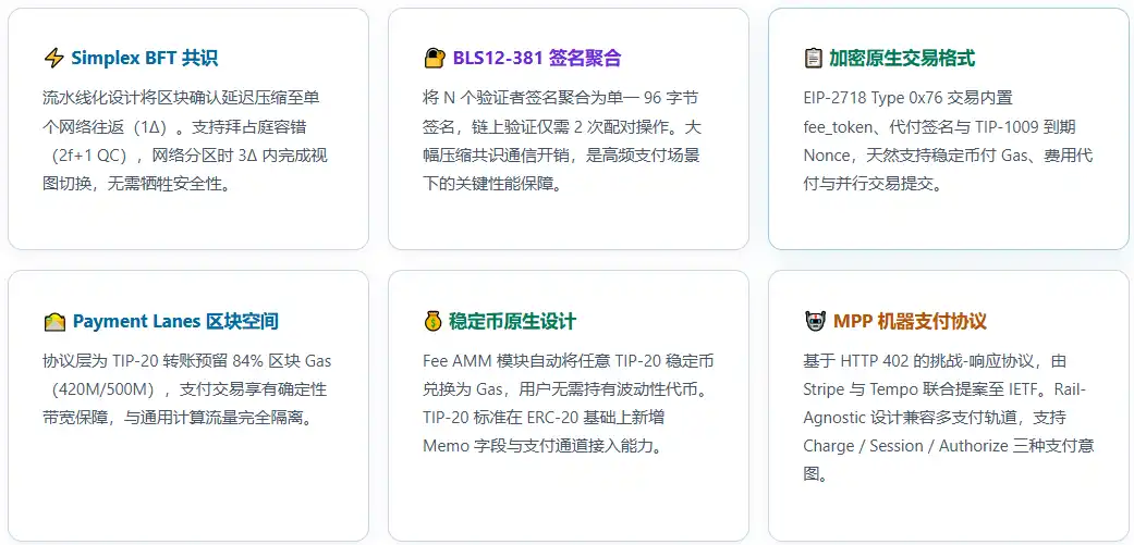 En tant que blockchain native aux paiements lancée par Commonware, Tempo utilise le consensus pipeline Simplex BFT pour une finalité en moins d'une seconde, garantit la priorité des paiements grâce à un espace bloc dédié et un mécanisme de Gas natif en stablecoin, et fournit aux agents IA une capacité de paiement de bout en bout sans intervention humaine via le protocole MPP.