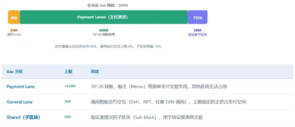 Les Payment Lanes sont un espace bloc réservé spécifiquement au niveau protocolaire pour les transactions de paiement TIP-20. Contrairement à Ethereum où toutes les transactions se disputent le même pool de gaz, Tempo divise le budget de gaz du bloc en plusieurs canaux indépendants, isolant ainsi les transactions de paiement des interférences des « voisins bruyants » comme les opérations DeFi, les minting de NFT ou les appels de contrats à haute fréquence.
