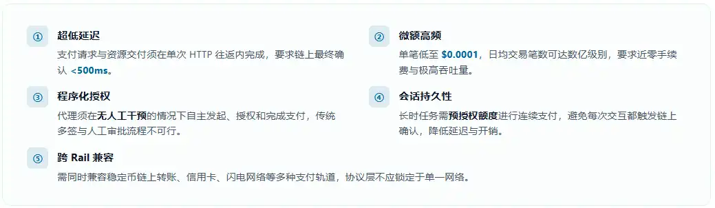 Lorsqu'ils exécutent des tâches autonomes, les agents IA (Autonomous AI Agents) présentent des comportements de paiement fondamentalement différents des paiements humains traditionnels. Les cinq besoins fondamentaux suivants constituent les exigences de base de l'économie des agents IA en matière d'infrastructure de paiement :