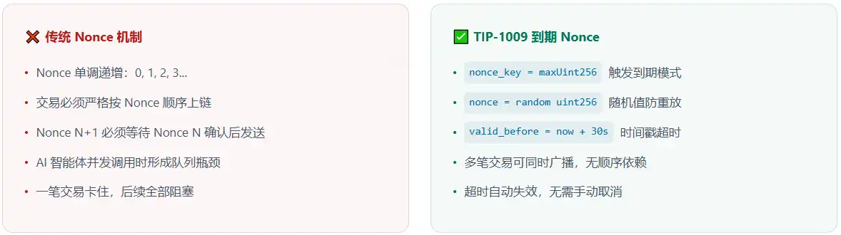Le Nonce strictement croissant de l'EVM traditionnel impose une exécution séquentielle de toutes les transactions d'un même compte. Tempo remplace le Nonce par une « plage de blocs valide », exigeant seulement que le Nonce soit unique pendant sa période de validité. Ainsi, plusieurs transactions indépendantes d'un même compte peuvent être soumises simultanément et exécutées concurremment, éliminant le goulot d'étranglement séquentiel au niveau du compte.